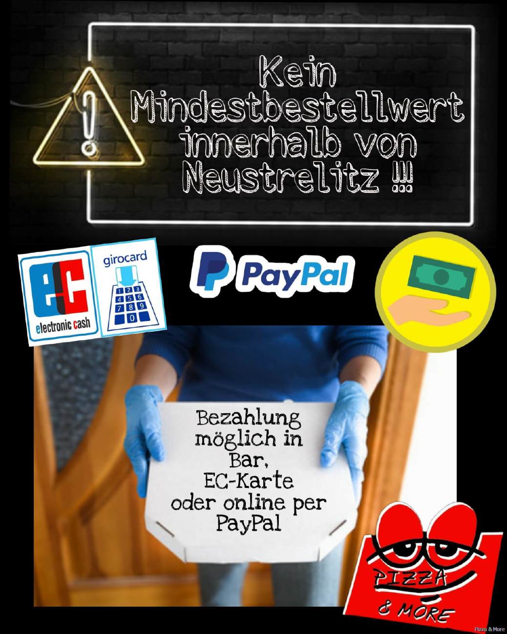 Du hast gerade kein Bargeld zur Hand, dass ist kein Problem. Bei Pizza & More Lieferservice Neustrelitz kannst du direkt online per PayPal bezahlen oder jetzt neu bequem an der Haustür mit der EC Karte oder der Kreditkarte.