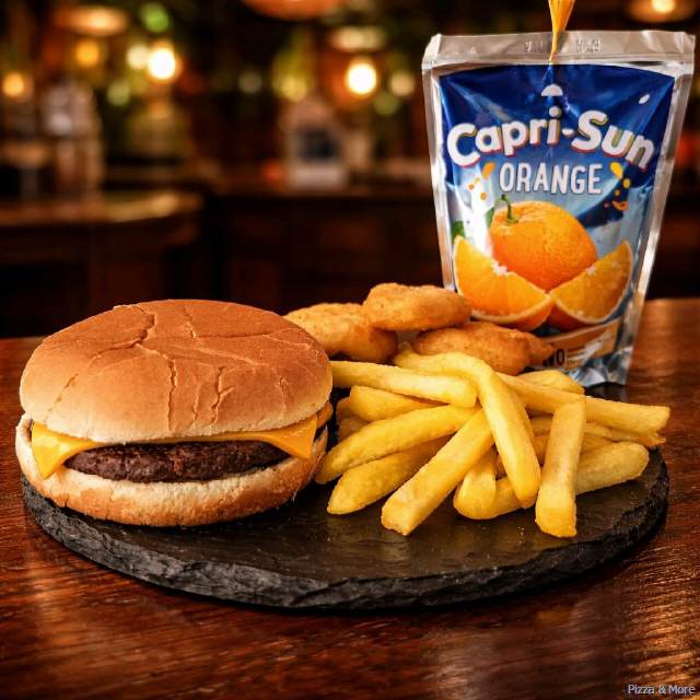 5 Chicken Nuggets mit kleiner Portion Pommes Fritz und Ketchup oder Mayo dazu eine Capri Sonne